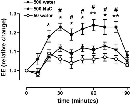 아래 이미지는 이 효과를 보여줍니다. 맨 윗 줄은 500ml의 물이 신진 대사를 어떻게 증가 시켰는지 보여줍니다.